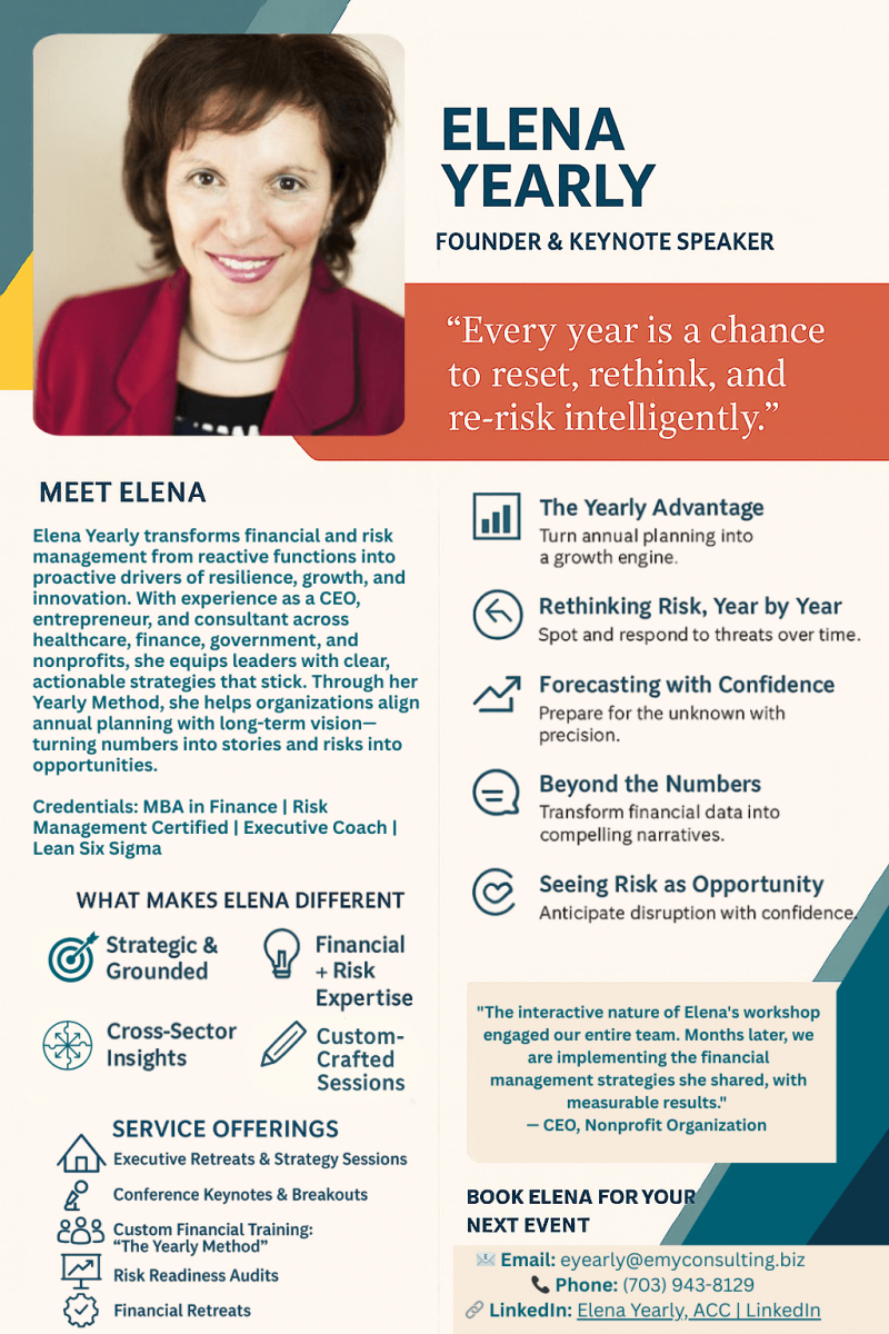 Elena Yearly equips today’s leaders with the insight, strategy, and tools to navigate complexity through a combined lens of financial intelligence and risk foresight. A sought-after speaker, advisor, and facilitator, Elena transforms financial and risk management from reactive functions into proactive drivers of resilience, growth, and innovation.